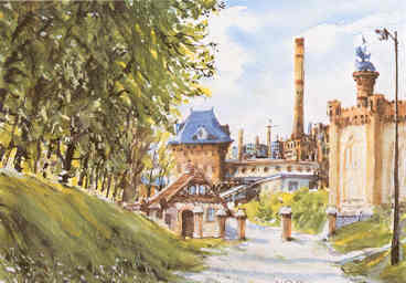 Strassen mit dem Schelmenturm als große Aqua-relle festzuhalten. Dazu die