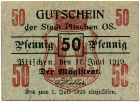 Po raz pierwszy magistrat Byczyny zdecydował się wtedy na emisję bonów, zwanych notgeldami, o nominałach 10, 25 i 50 fenigów,