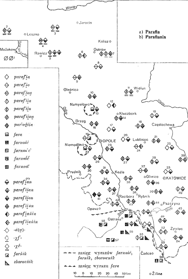 Na kóniec mapka z "Atlasu językowego Śląska" A. Zaręby (tóm szósty), z