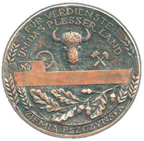 Auf der anderen Seite dieser Medaille sind die Worte: „Für Verdienste um das Plesser Land“ sowie den