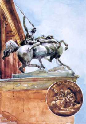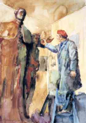 Ich persönlich befand mich in einer anderen Lage. Nach Beendigung der Krakauer Kunstakademie sah ich mich gezwungen nach Tichau zurückzukehren. Tichau, welches in der Mitte der 50-er Jahre unseres Jahrhunderts auch einen gewaltigen Aufschwung nahm, hatte den von mir erwartenden Sinn für Kunst und Schönheit im Bauwesen nicht. Ich erhielt zwar einige Aufträge für Denkmäler und Standbilder, sie reichten aber bei weitem nicht aus, um mein Talent in der Bildhauerkunst weiter zu entfalten. Ich war immer auf eigene Initiative und Rechnung angewiesen. Abgesehen davon freue ich mich im Leben und in Werken meines Namensvetters und Bildhauers vor über 130 Jahren viel Ähnliches in meiner Tätigkeit auf demselben Gebiet zu entdecken. Das 6. Diplomjahr war voller innerer Zerrissenheit, Vollendung meines Studiums und der unerschütterliche Wille, so gut wie möglich abzuschneiden. Das gelang mir auch, denn dort wo ein Wille ist, ist auch ein Weg. Die Krakauer Kunstakademie, Abteilung Bildhauerei, beendete ich mit Auszeichnung im Jahre 1954 und gleich darauf erhielt ich den ersten Auftrag. Ich meißelte aus Stein eine 3 Meter hohe Figur, welche einen siegreichen polnischen Soldaten darstellte, sowie ein Relief in der Größe von 3 x 2,20 Meter. Außerdem fertigte ich aus reinem Silberblech einen Rahmen, welcher für ein Muttergottesbild bestimmt war. Diese Aufträge beendete ich in der Werkstatt eines mir bekannten Bildhauers in Krakau und lieferte meine Arbeiten an den Auftraggeber aus. Ich erhielt noch eine Reihe von anderen Aufträgen, welche der damals entsprechenden Zeit und Ideologie Propagandazwecke hatten. Andere Aufträge gab es nicht. Doch die Zeiten änderten sich, und vom Oktober 1956 fing in Polen eine neue Zeit an, die mit dem bisher herrschenden Stalinismus nichts mehr zu tun hatte. Tichau war im Aufbau begriffen. Tatsächlich wurde eine neue, riesengroße Siedlung gebaut, die der Stadt eine neue Prägung gaben. Ich hatte die Hoffnung, bei dieser Gelegenheit neue Aufträge zu erhalten, und damit an dem Neubau mitzuwirken. Der Hauptplaner der neuen Siedlung war Professor Toddorowski. Tatsächlich gab er mir den Auftrag, an der Wand eines Hauses ein Relief anzubringen, und eine lebensgroße Figur eines Sportlers herzustellen. Außerdem fertigte ich ein Projekt „Junge mit den Gänsen” aus, welches für eine Fontäne bestimmt war.