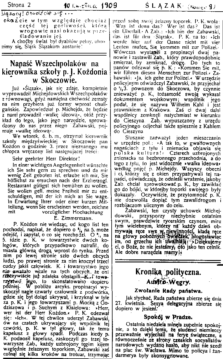 ŚLĄZAK, Gazeta ludowa, Organ Śląskiej Partyj Ludowej, Mor. Ostrawa, 10.04.1909, strona 2 (fragment)