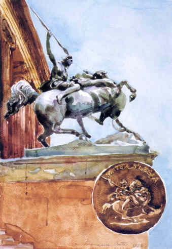 Bundeskanclerza w Berlinie stoi dumnie pomnik wysokości 3 m 70 cm - „Amazonka na koniu" dzieło Augusta Kissa urodzonego w 1802